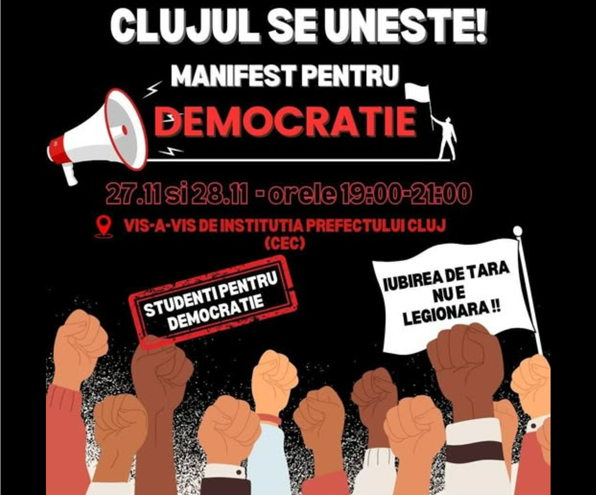 Clujul se pregătește să fie din nou epicentrul unei mișcări civice importante. Studenții clujeni organizează un protest sub sloganul "Manifest pentru democrație", programat pentru serile de 27 și 28 noiembrie, între orele 19:00 și 21:00, în fața Instituției Prefectului Cluj.
