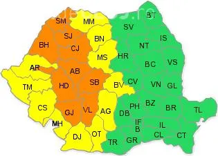 În judeţele Satu Mare, Sălaj, Bihor, Cluj, Alba, Hunedoara, Sibiu, Gorj, Vâlcea şi zona de munte a judeţului Arad, ploile vor avea caracter torenţial, iar cantităţile de apă vor depăşi local 60...70 l/mp.