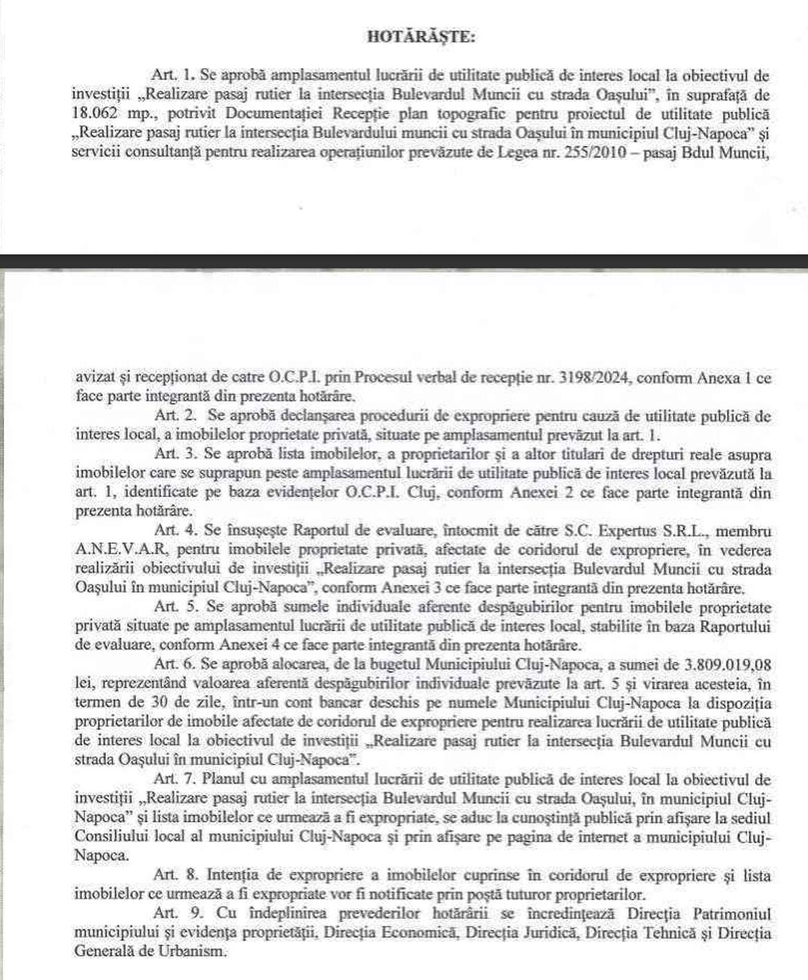 Art. 2: Se aprobă declanșarea procedurii de expropriere pentru cauză de utilitate publică a imobilelor de pe amplasamentul prevăzut la art. 1.