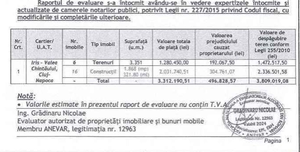 Art. 4: Se însușește raportul de evaluare întocmit de S.C. Expertus S.R.L., membru ANEVAR, pentru imobilele afectate.