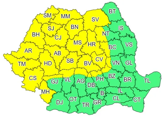 Meteorologii de la ANM au emis, marți dimineață, un nou avertisment de tip cod galben de vreme rea, care afectează 27 de județe din țară, printre care și Clujul.