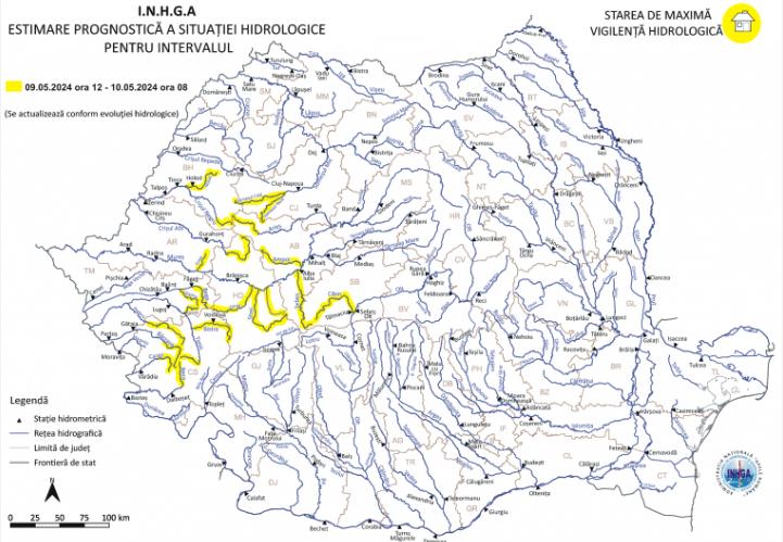 Institutul Național de Hidrologie și Gospodarire a Apelor (INHGA) a emis o avertizare Cod Galben de inundații care va fi în valabilă în intervalul 09.05.2024 ora 12:00 – 10.05.2024 ora 08:00.