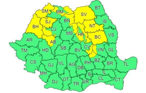Vântul va prezenta intensificări și în nordul Crișanei, nord-vestul Transilvaniei și în dealurile subcarpatice ale Moldovei, în general cu viteze de 55...75 km/h.