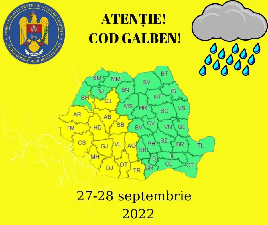 Județul Cluj se află începând de marți, 27 septembrie 2022, de la ora 11:00, se va afla sub avertizare meteorologică Cod Galben de instabilitate atmosferică temporar accentuată valabilă până mâine, 28 septembrie, la ora 06:00, conform informării transmise de către Administraţia Naţională de Meteorologie.