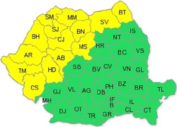 Meteorologii au emis o avertizare de tip Cod Galben valabilă pentru Vestul țării.