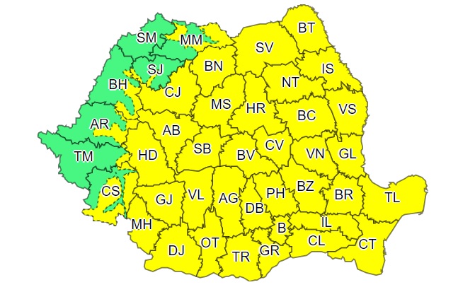 Avertismentele intră în vigoare de luni seară, după cum urmează: