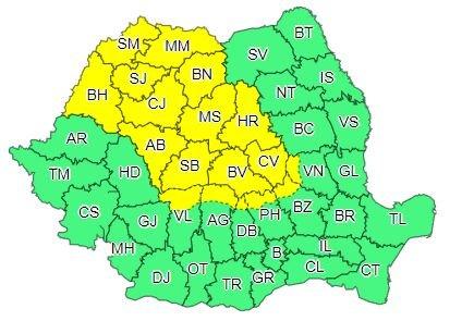 Prima avertizare cod galben intră în vigoare astăzi, la ora 15:00 și rămâne valabilă până mâine dimineață, la ora 06:00.