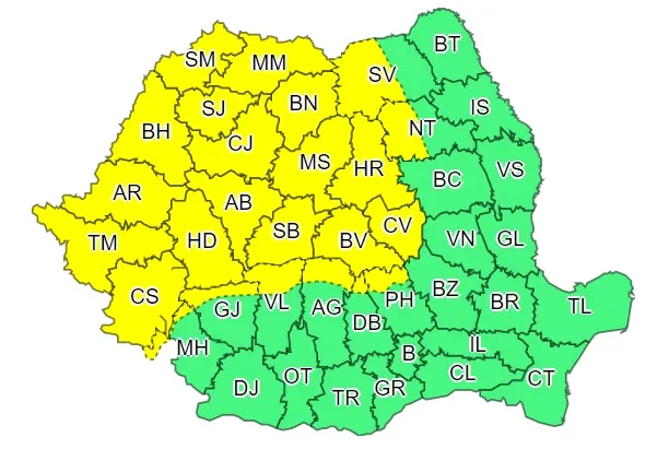 Meteorologii de la ANM au emis o serie de avertismente de tip cod galben, valabile din aceastp noapte, care vor afecta mai bine de jumătate de țară, județul Cluj fiind afectat.