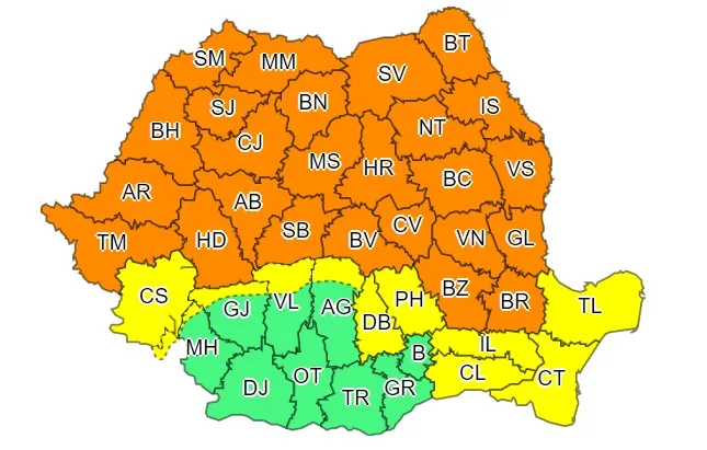 Meteorologii de la ANM au emis o serie de avertismente de tip cod portocaliu și cod galben de furtuni pentru aproape toată țara.