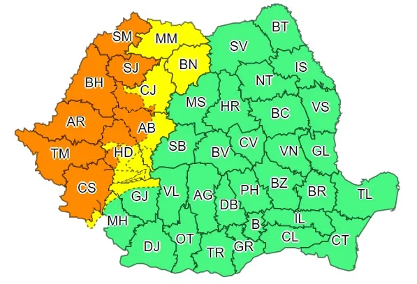 În județele Timiș, Arad, Bihor, Satu Mare, Sălaj, Caraș Severin, precum și în zona de munte a județelor Hunedoara, Alba și Cluj vor fi intervale cu intensificări puternice ale vântului (rafale de 80...90 km/h), vijelii, frecvente descărcări electrice și grindină.Pe arii restrânse vor fi averse torențiale și se vor acumula cantități de apă de peste 35...60 l/mp.