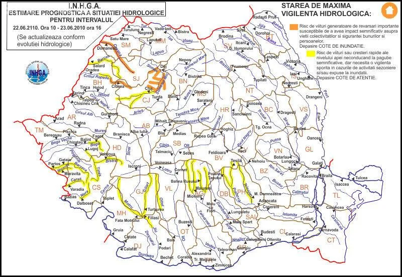 - Se mentine si se instituie COD GALBEN pe raurile din bazinele hidrografice: Somesul Mic curs superior si afluenti (jud. Cluj), Barcau (jud. Salaj si Bihor), cursurile superioare ale Begai (jud.Timis) si Timisului (jud. Caras Severin si Timis), Barzava (jud. Caras Severin si Timis), Moravita (jud. Caras Severin si Timis), Caras (jud. Caras Severin), Nera (jud. Caras Severin), Motru (jud. Gorj si Mehedinti), Gilort (jud. Gorj), Jiu-sector Filiasi-Racari (jud. Dolj), afluentii Oltului inferior (jud. Valcea), afluentii din zona de deal si munte ai Argesului (jud.Arges) si Prahovei (jud. Prahova).