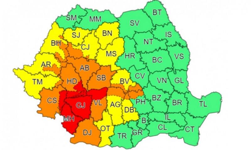 Un cod portocaliu a intrat în vigoare la ora 10.00 pentru județele Mehedinți, Gorj, Dolj, Vâlcea, Caraș-Severin, Hunedoara, Sibiu și Alba și în zona de munte a județelor Timiș, Cluj, Arad, Bihor, Argeș, Dâmbovița, Brașov și Prahova. Până mâine dimineață vor fi averse torențiale și izolat căderi de grindină. Local cantitățile de apă vor fi de 30...40 l/mp și izolat de peste 60 l/mp (în intervale scurte de timp, de până la 1 – 3 ore).