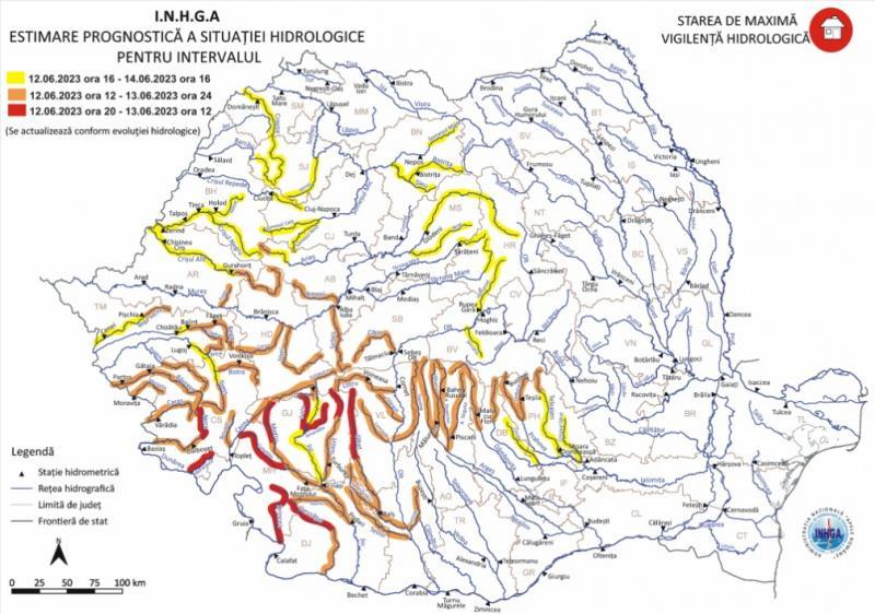 De luni de la ora 12.00 până marți la ora 24.00 este cod portocaliu pe râurile din bazinele hidrografice: Crişul Alb (judeţele: Hunedoara şi Arad), Arieş (judeţul Alba), Mureş (judeţele: Alba şi Cluj), Mureş (judeţele: Alba, Hunedoara, Sibiu şi Arad), Bega Veche, Bega (judeţul Timiş), Timiş (judeţele: Caraş Severin şi Timiş), Pogăniş (judeţul Caraş Severin), Bârzava, Moraviţa (judeţele: Caraş Severin şi Timiş), Caraş, Nera (judeţele: Caraş Severin şi Timiş), Cerna (judeţele: Gorj şi Caraş Severin), Dunăre (judeţele: Dolj, Mehedinţi şi Caraş Severin), Desnăţui (judeţele: Mehedinţi şi Dolj), Jiu (judeţele: Hunedoara, Gorj, Mehedinţi şi Dolj), Olt (judeţele: Sibiu, Vâlcea, Gorj, Argeş, Olt şi Dolj), Argeş, Dâmboviţa (judeţele: Argeş şi Dâmboviţa), Ialomiţa (judeţele: Dâmboviţa şi Prahova), Prahova, Teleajen (judeţul Prahova).