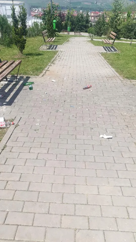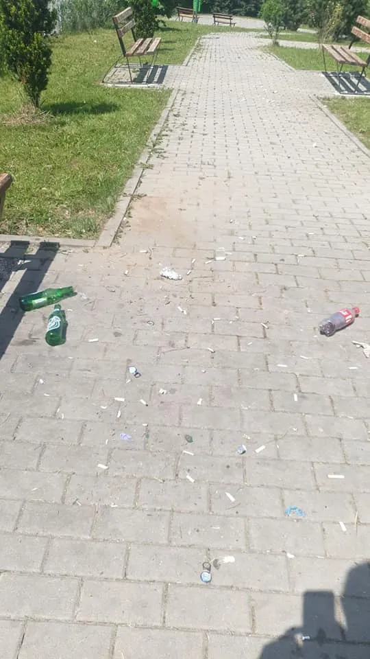 Aleile unui parc din Florești sunt pline cu coji de semințe și sticle de bere, în timp ce coșurile de gunoi sunt goale.