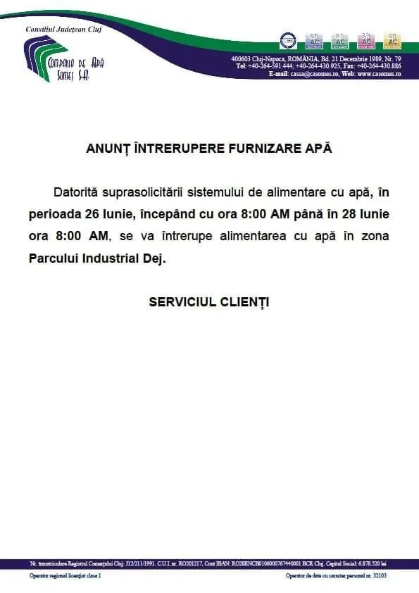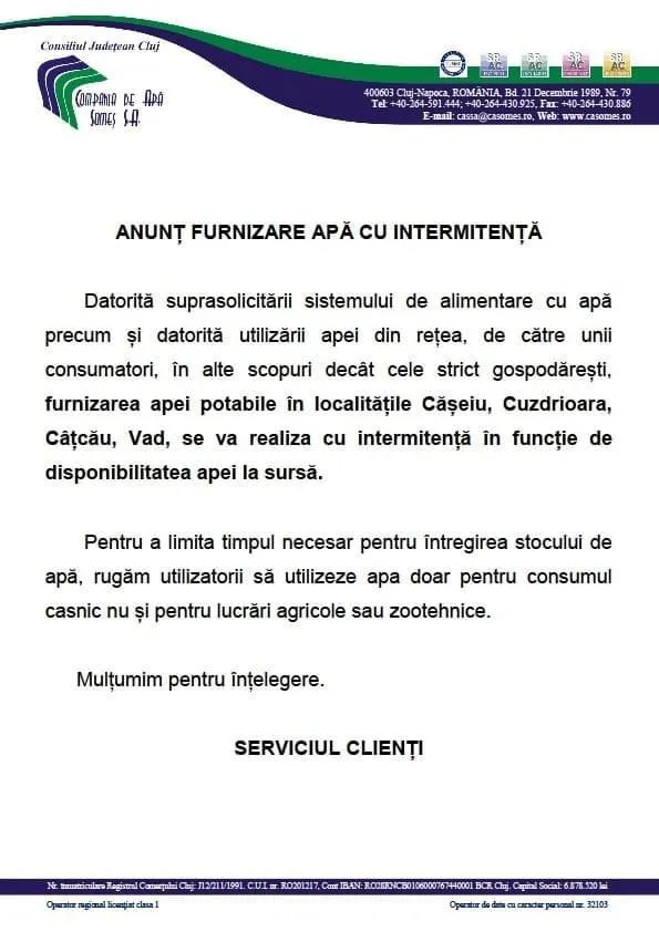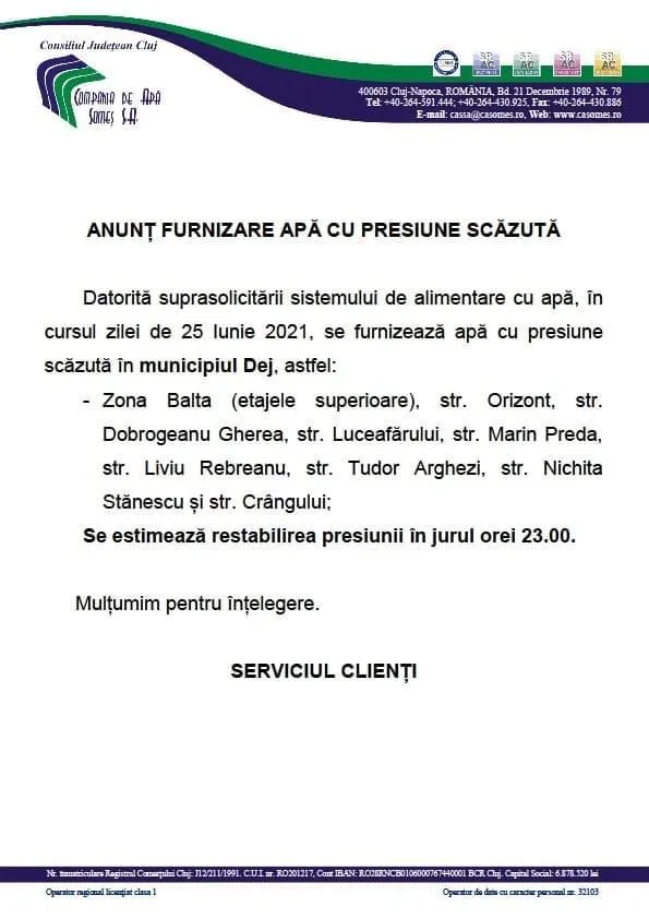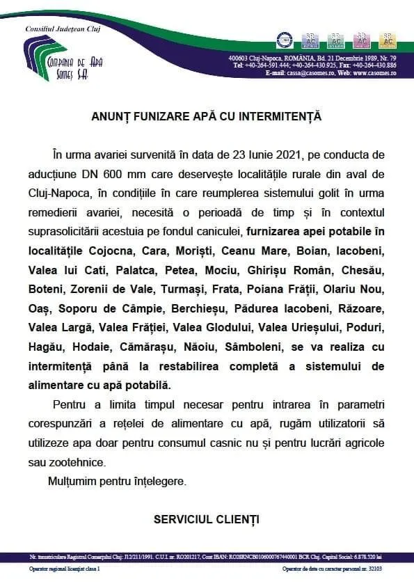 E drept că în 23 iunie a avut loc o avarie pe rețea, dar aceasta s-a rezolvat. Totuși, Compania de Apă Someș nu livrează apă corespunzător nici acum, motivând că rețeaua este suprasolicitată. Practic vina este a oamenilor, care din 1 iulie plătesc cu 9% în plus pentru a beneficia de serviciile Companiei.