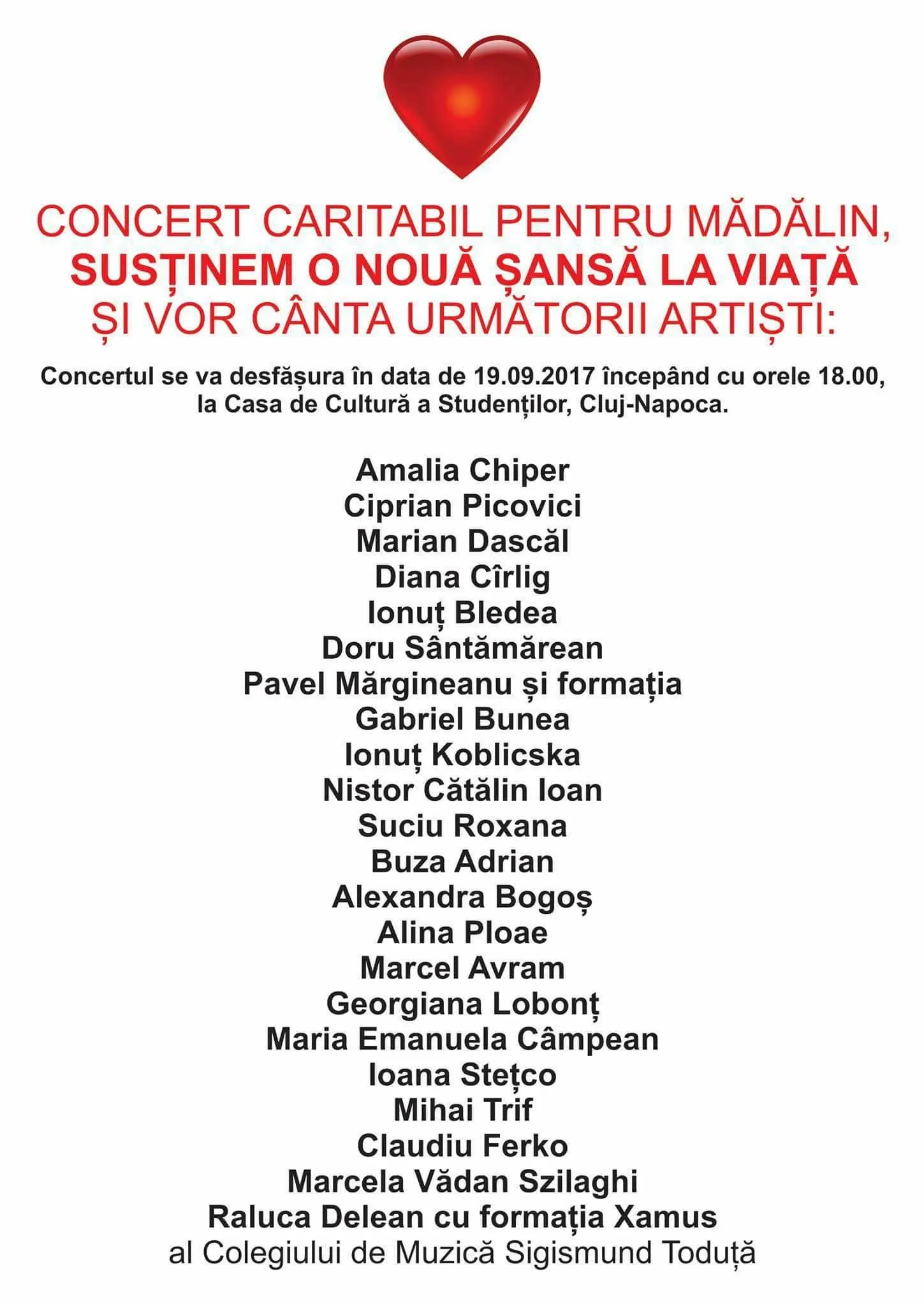 Clujenii sunt invitaţi la un concert caritabil care va avea loc marţi, 19 septembrie, la Casa de Cultură a Studenţilor din Cluj-Napoca.