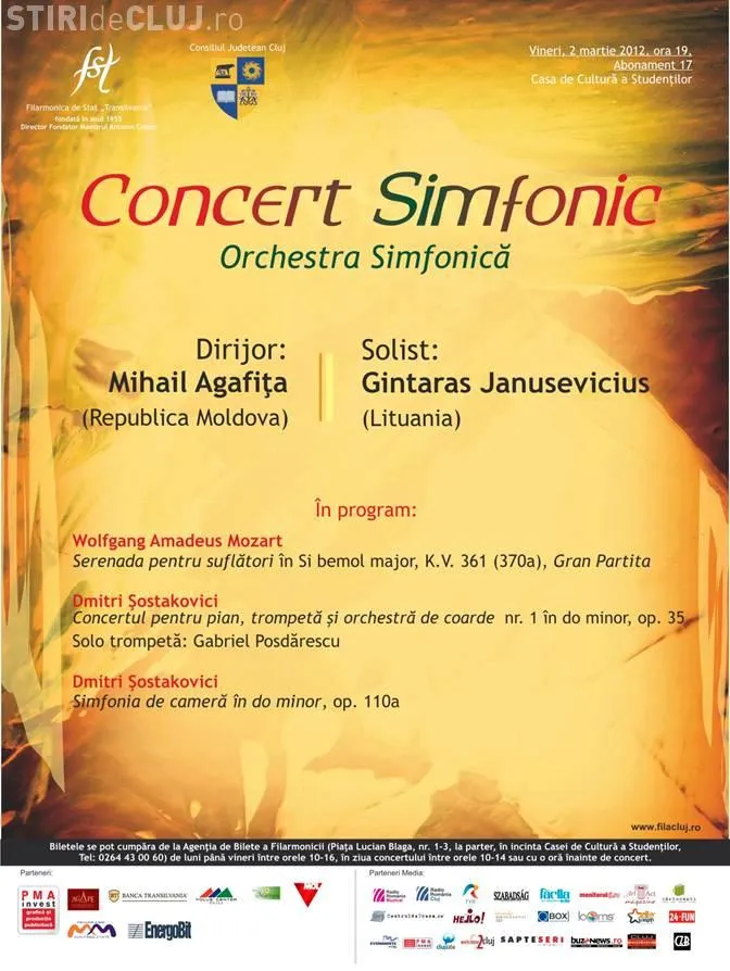 Concertul simfonic este sustinut de Orchestra Simfonica a Filarmonicii de Stat "Transilvania" si va avea loc in 2 martie, de la ora 19:00 la Casa de Cultura a Studentilor din Cluj-Napoca.