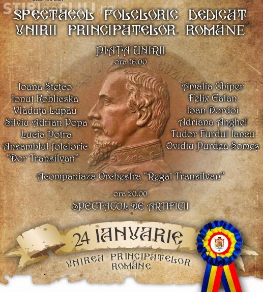 Evenimentele vor începe duminică, 24 ianuarie 2016, de la ora 16.00, în Piaţa Unirii, cu un spectacol folcloric, susţinut de următorii interpreţi: Ioana Şteţco, Ionuţ Koblicska, Vlăduţa Lupău, Silviu Adrian Popa, Lucia Potra, Ansamblul folcloric „Dor Transilvan”, Amalia Chiper, Felix Gălan, Ioan Dordoi, Adriana Anghel, Tudor Furdui Iancu, Ovidiu Purdea Someş. Spectacolul va fi acompaniat de Orchestra „Regal Transilvan”.