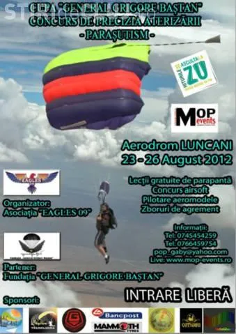 Prima ediţie a Concursului de precizia aterizării la paraşutism, Cupa "General GRIGORE BAŞTAN" se va desfăşura în conformitate cu regulamentele FAI (Federatia Aeronautica Internationala) si este destinat echipelor de parasutisti formate din 4 atleţi (bărbaţi, femei sau mixt) precum si competitorilor individuali care deţin licenţă de zbor şi licenţă medicală valabile. Aeronava din care se vor face salturile este de tip AN-2. Clasamente: Echipe şi individual mixt (bărbaţi, femei, seniori si juniori).