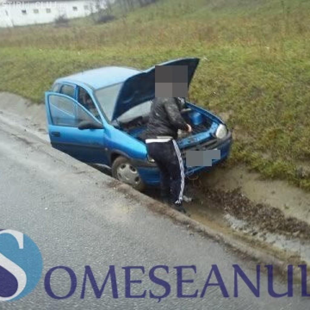 Condițiile meteo le dau bătăi de cap participanților la trafic. Un șofer a ajuns cu mașina în șanț pe un drum din Cluj FOTO