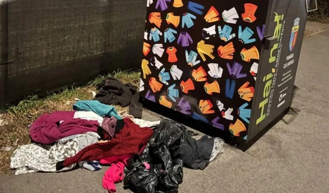 Container de haine vandalizat în cartierul Andrei Mureșanu din Cluj-Napoca! Donațiile au fost aruncate pe jos
