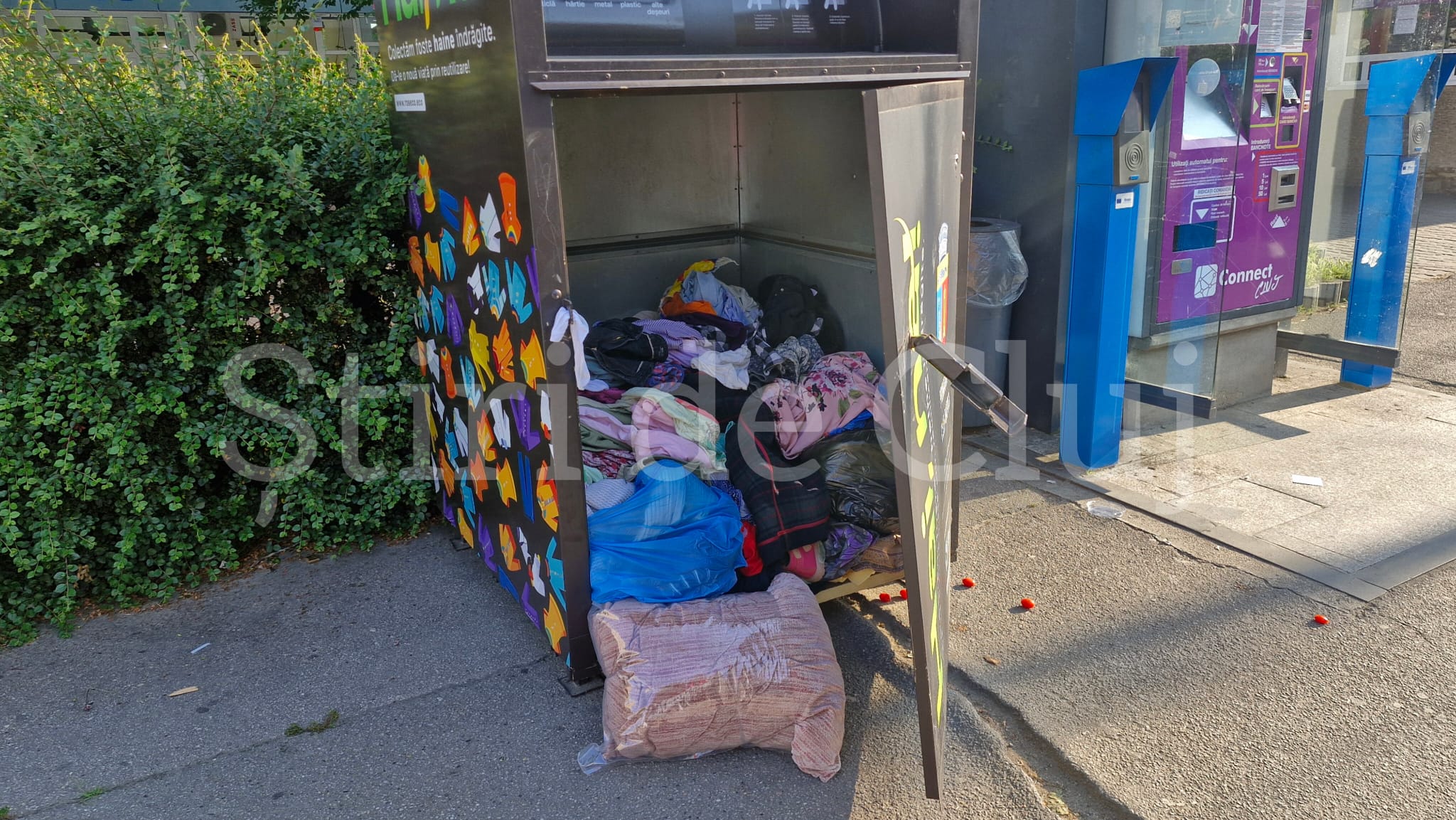 Containerul de haine dintr-o stație de autobuz din Cluj-Napoca a fost spart sub ochii trecătorilor. Făptașii, de negăsit