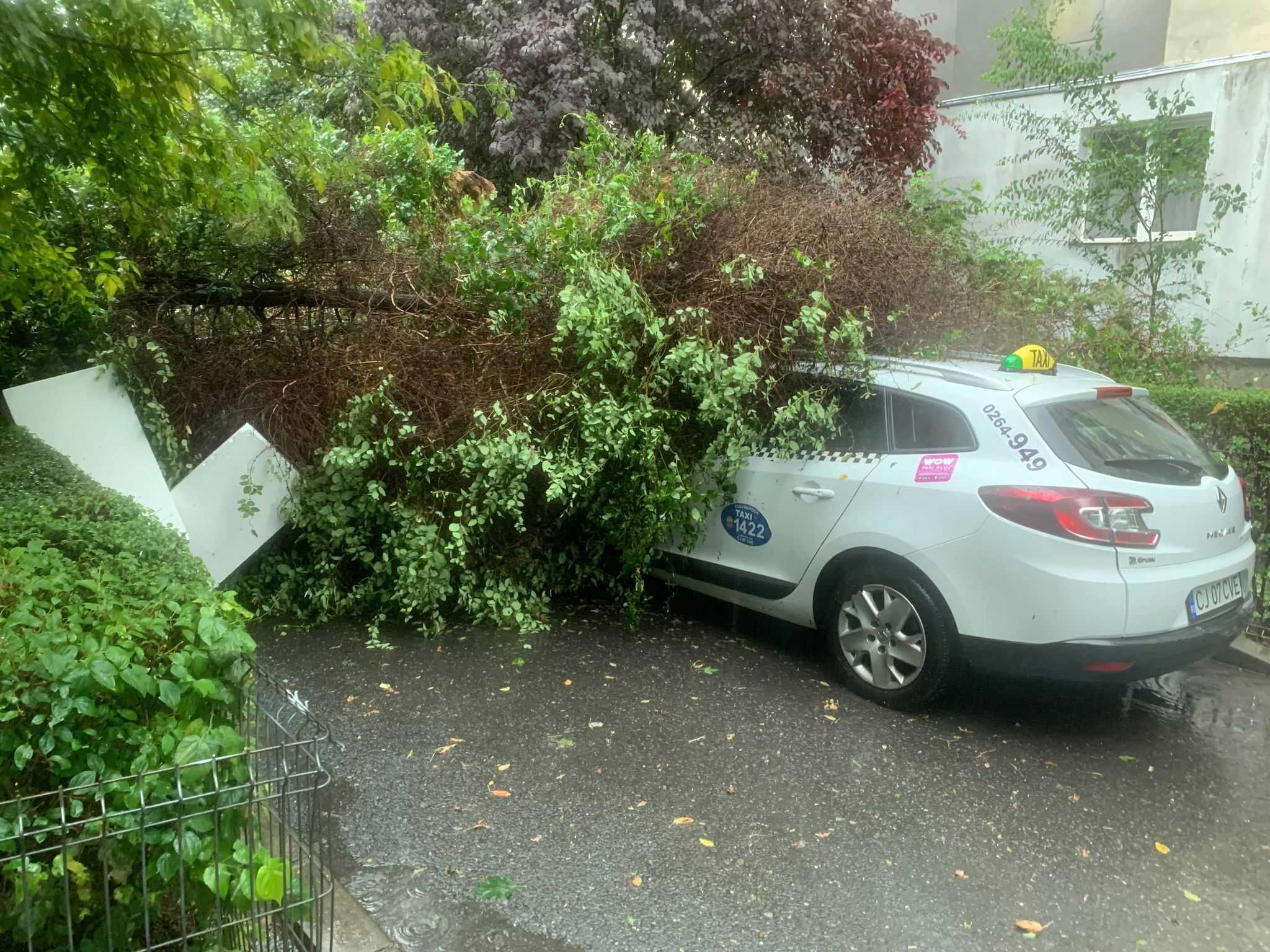 Bradul a căzut peste câteva mașini parcare. Oamenii spun că se știa să este șubred, dar Primăria Cluj-Napoca nu a permis tăierea arborelui ornamental.