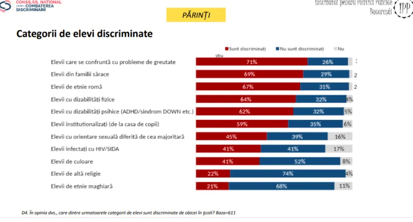 La întrebarea „Dvs. personal, în ce masură considerați că în școlile din România există cazuri de discriminare pe diverse criterii, cum ar fi: rasă, etnie, religie, orientare sexuală etc. ?”, 46% din părinți au răspuns „În mică măsură”, 36% „În mare măsură”, 9% „Deloc”, 6% „În foarte mare măsură” și 2% „Deloc”.