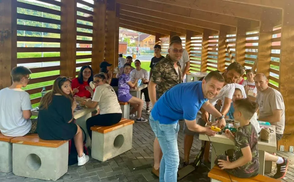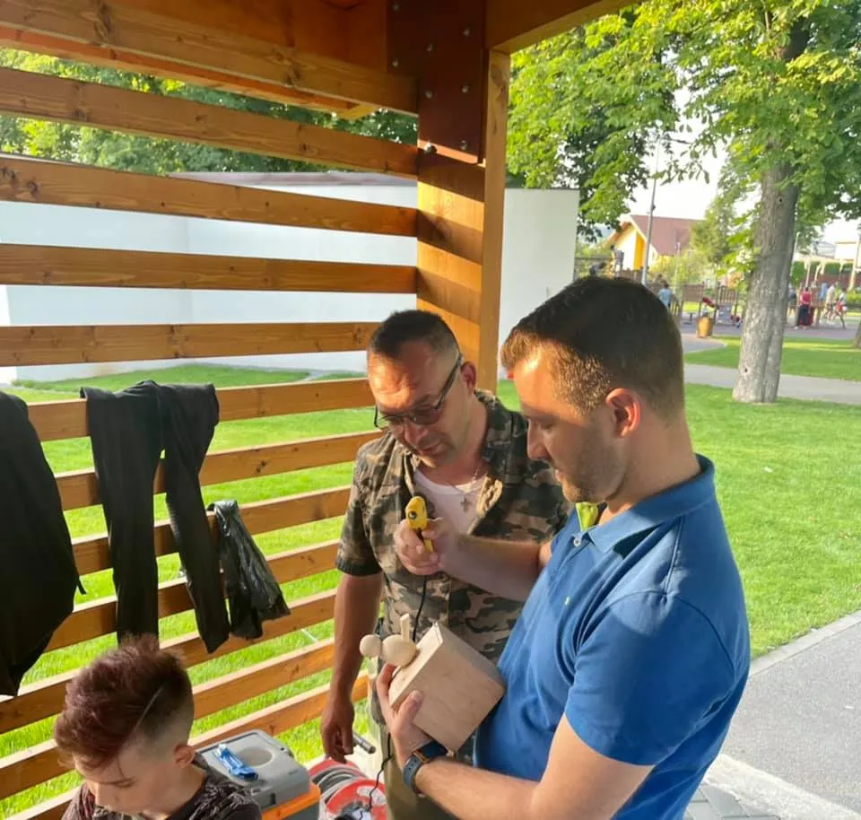 Surpriza a fost Organizația PNL Floresti, consilieri locali si județeni care s-au alăturat, unul cu scara, unul cu ciocanul, unul cu pistolul de lipit si cutterul, altul cu o punga de înghețată pentru copilași. A fost emoționant efectiv. Pana și doamna responsabilă cu curățenia în parc a venit și ne-a adus saci menajeri si ne-a ajutat sa întindem prelungitorul de curent.