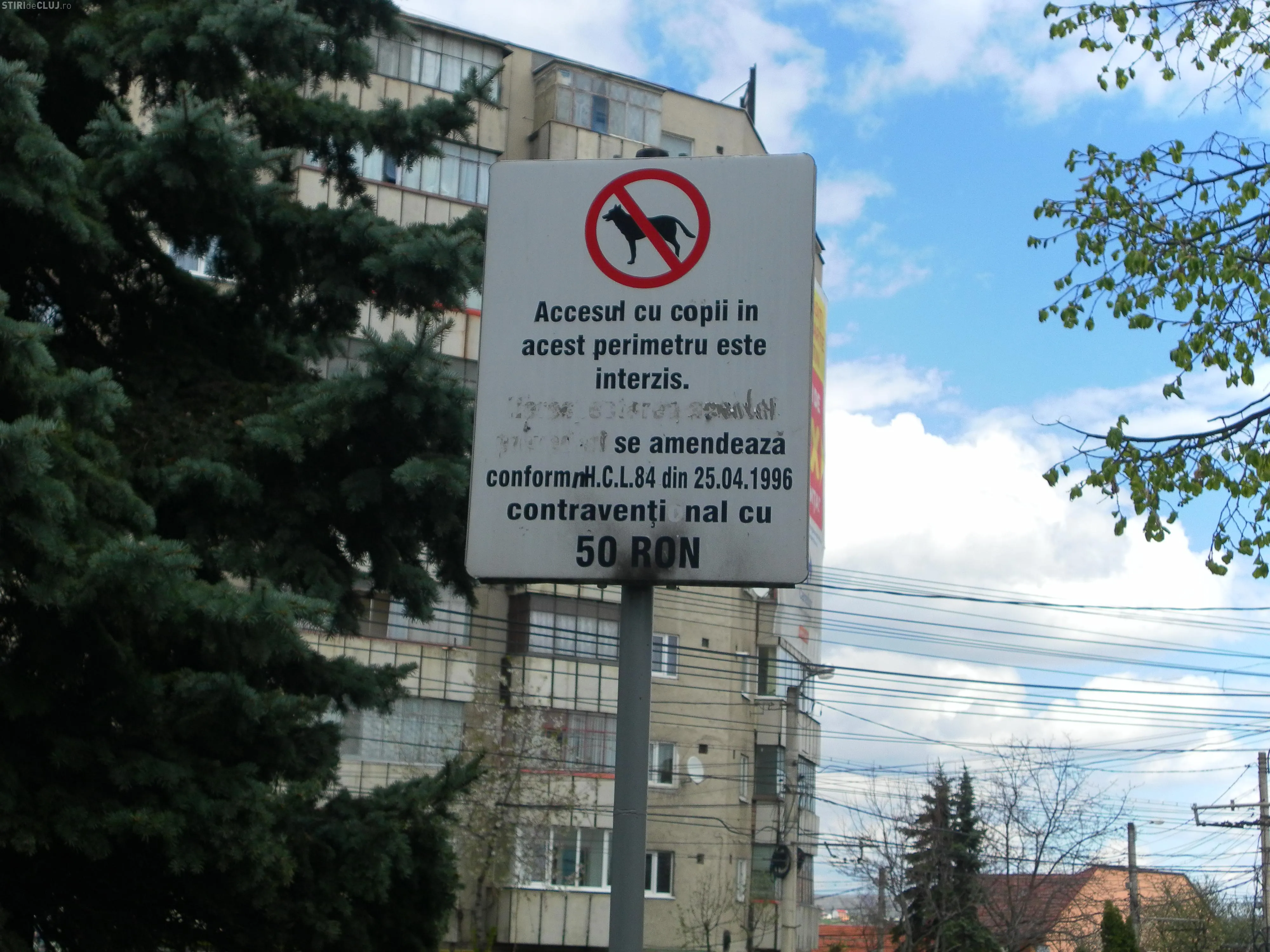 ""Accesul cu copii in acest perimetru este interzis... Amenda este 50 de lei!", scrie pe un panou amplasat in parcul de pe strada Izlazului la intersectia cu strada Campului.
