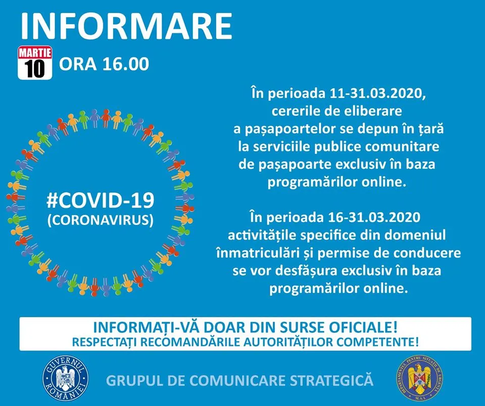 Grupul de Comunicare strategică anunță că, în perioada următoare, programările pentru eliberarea pașapoarte lor sau pentru perimsee de condicere și înmatriculare a vehiculeleor se mai pot face doar online.