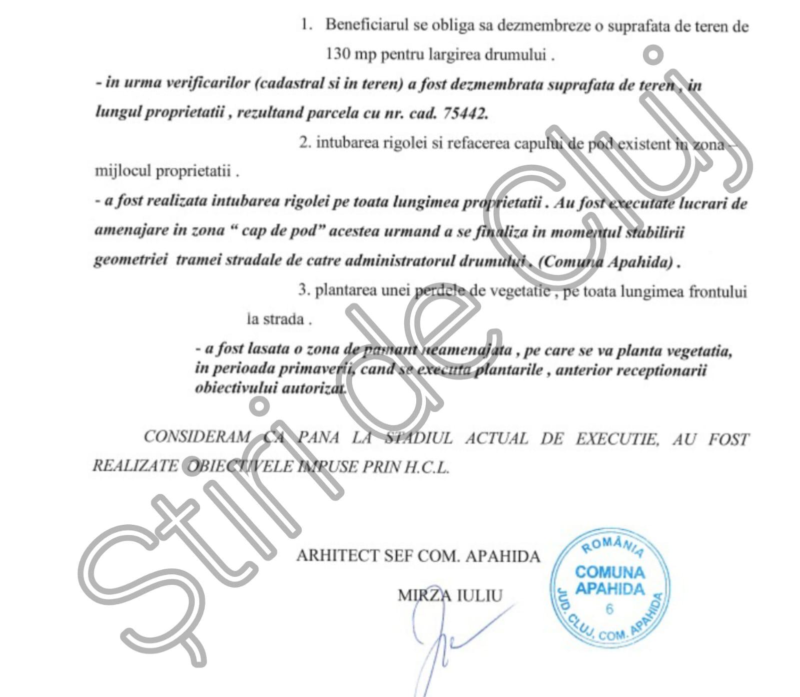 În urma verificărilor efectuate pe teren, s-a constatat că ,,până la stadiul actual de execuție, au fost realizate obiectivele impuse prin H.C.L", potrivit raportului trimis către Știri de Cluj: