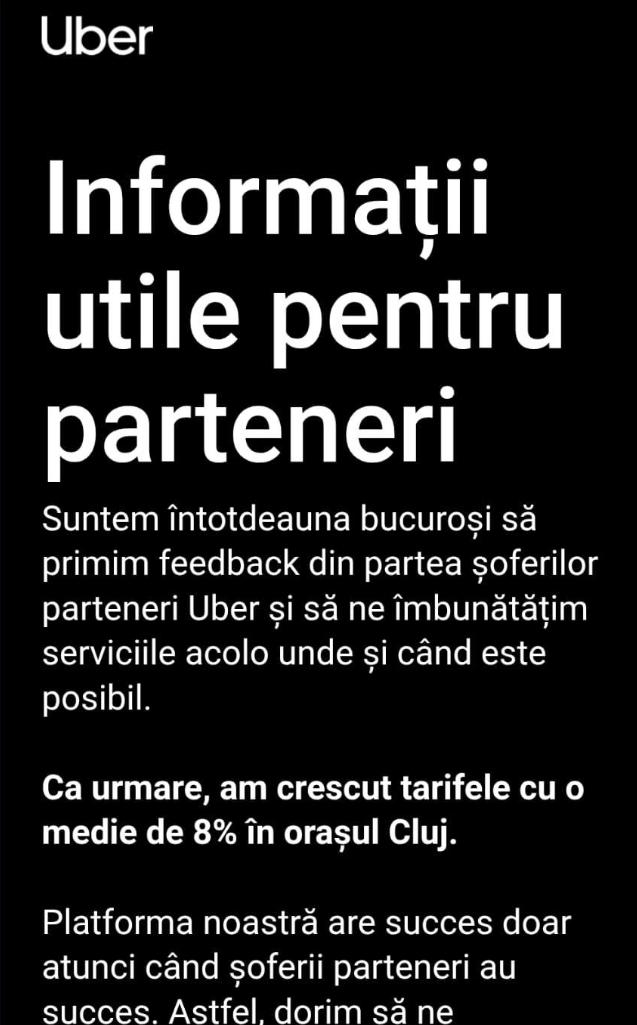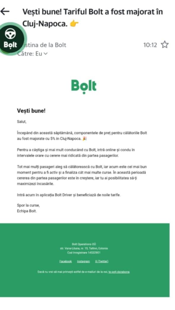 „Salut, începând din această săptămână, componentele de preț pentru călătoriile Bolt au fost majorate cu 5% în Cluj-Napoca. Pentru a câștiga și mai mult conducând cu Bolt, intră online și condu în intervalele orare cu cerere mai ridicată din partea pasagerilor. Tot mai mulți pasageri aleg să călătorească cu Bolt, iar acum este cel mai bun moment pentru a fi activ și a finaliza cât mai multe curse. În această perioadă cererea din partea pasagerilor este în creștere, iar tu ai posibilitatea să-ți maximizezi încasările. Intră acum în aplicația Bolt Driver și beneficiază de noile tarife”.