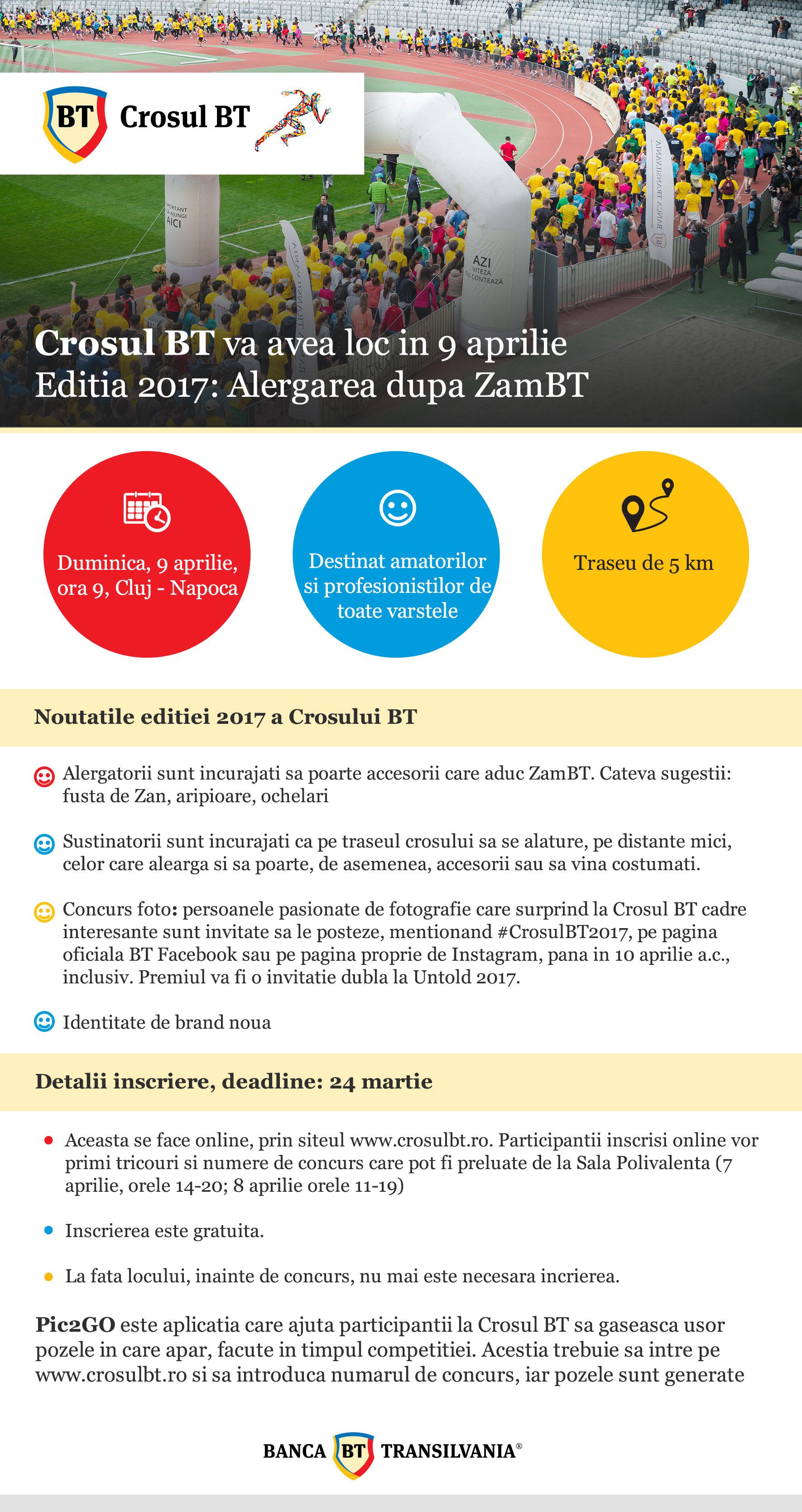 Concurs foto: persoanele pasionate de fotografie care surprind la Crosul BT cadre interesante sunt invitate să le posteze, menționând #CrosulBT2017, pe pagina oficială BT Facebook sau pe pagina proprie de Instagram, până în 10 aprilie a.c., inclusiv. Premiul va fi o invitație dublă la Untold 2017.