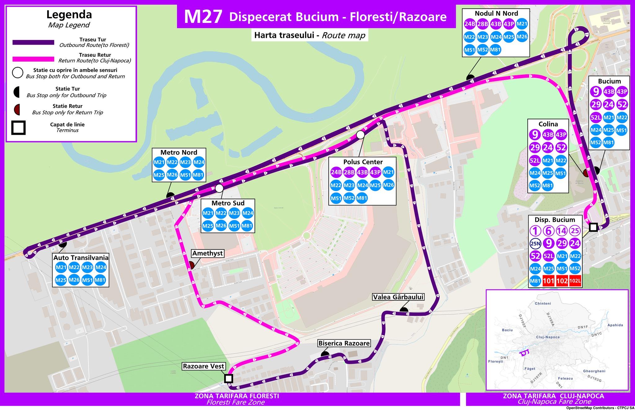 Programul complet al liniei M27 poate fi consultat pe www.ctpcj.ro sau direct din aplicația de mobil Tranzy, disponibilă gratuit. Aplicația îți permite să vezi în timp real când vine autobuzul, să urmărești traseul și să eviți timpii pierduți în stații.