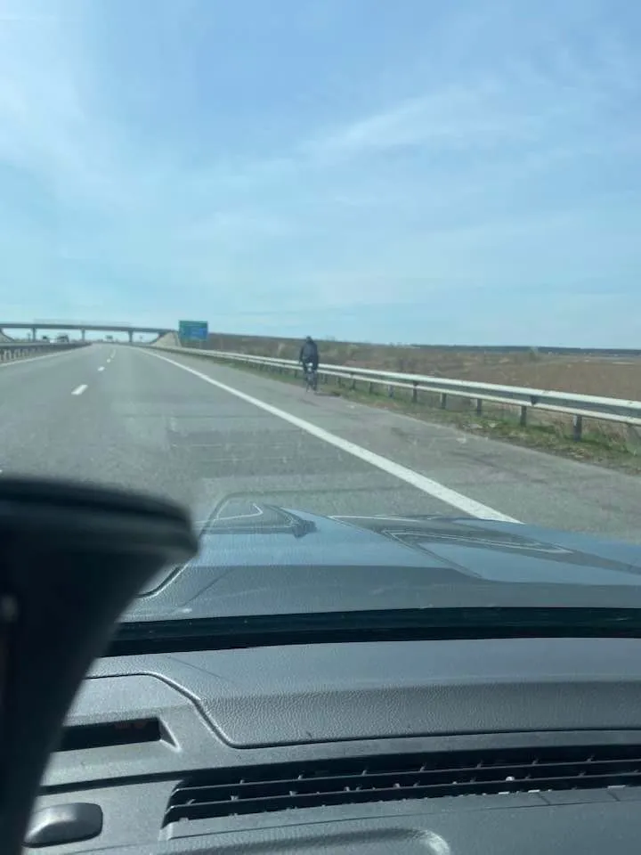 Un biciclist a fost surprins pe o autostradă din România, în timp ce circula liniștit de parcă era pe o pistă de biciclete.