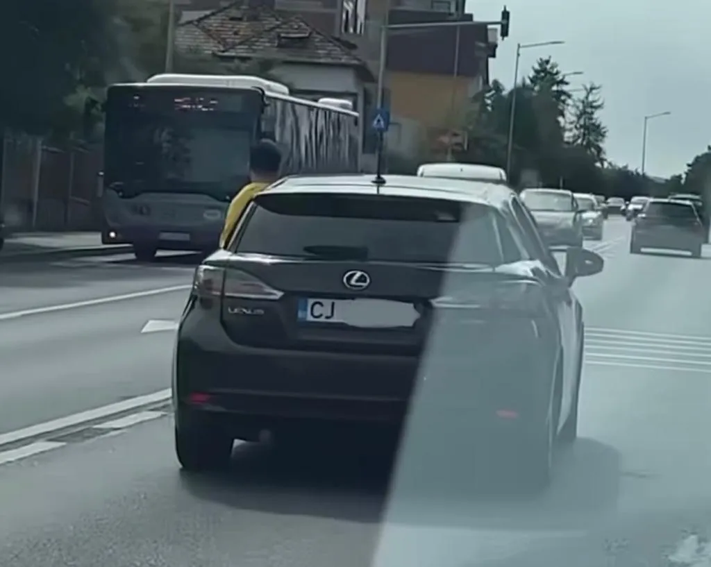 Un bărbat a fost surprins în timp ce conducea haotic, fiind mai mult afară decât în mașină, pe Calea Turzii din Cluj-Napoca. Martorii spun că bărbatul a condus așa încă din Piața Cipariu, formând o coloană în spatele lui.