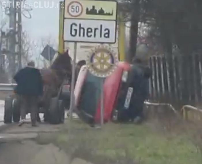 Un șofer s-a răsturnat cu mașina la ieșire din Gherla, vineri după-amiază.