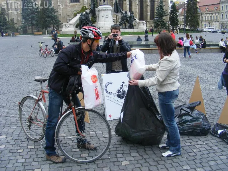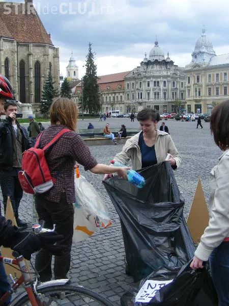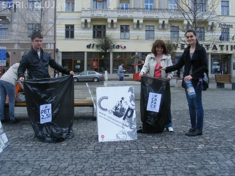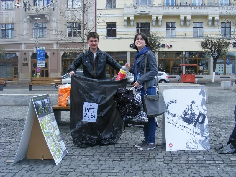 Tinerii de la COOP s-au adunat sambata, 21 aprilie, in Piata Unirii, iar intre orele 15.00 si 16.30, au colectat PET -uri de la clujeni.