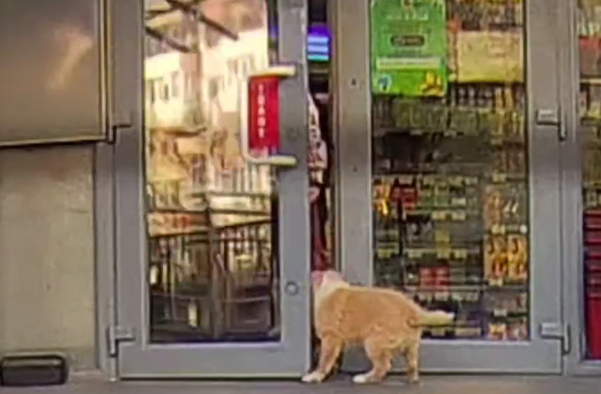Animăluțul a reușit să intre în magazin, moment în care o femeie i-a deschis ușa pentru a ieși. Acesta s-a conformat, însă s-a răzgândit instant și a reintrat în magazin, dând dovadă de o agilitate mare