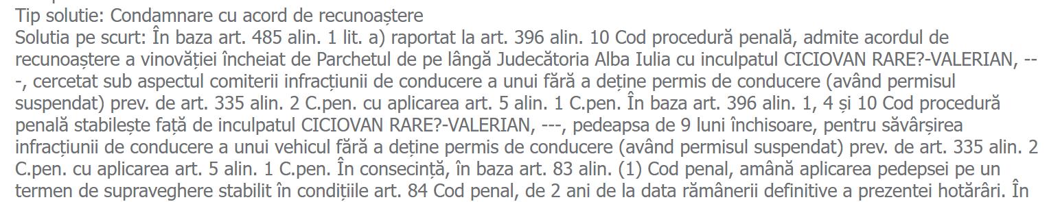 Instanța a admis acordul de recunoaștere a vinovăției încheiat de Parchetul de pe lângă Judecătoria Alba Iulia și a stabilit pedeapsa de 9 luni de închisoare. Totuși, datorită faptului că inculpatul a fost cooperant și și-a recunoscut vina, judecătorii au decis amânarea aplicării pedepsei pe un termen de supraveghere de 2 ani.