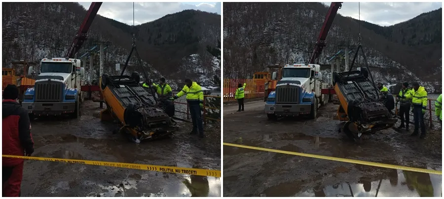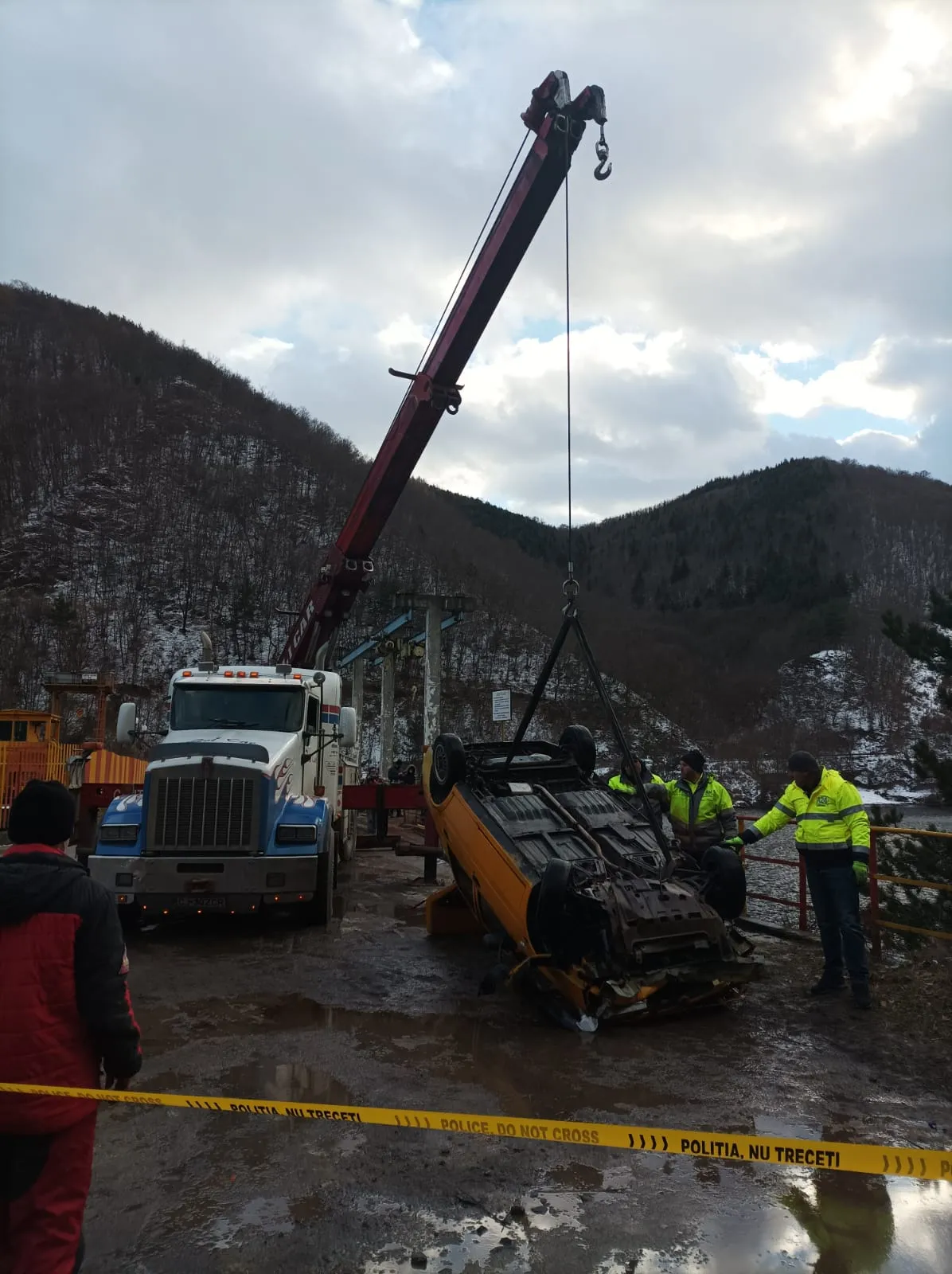 Dacia Nova care a căzut în lacul Someșul Rece, de pe baraj, incident în care au murit doi bărbați, a fost scoată cu o macara.