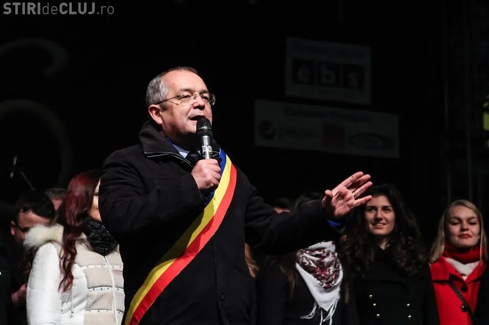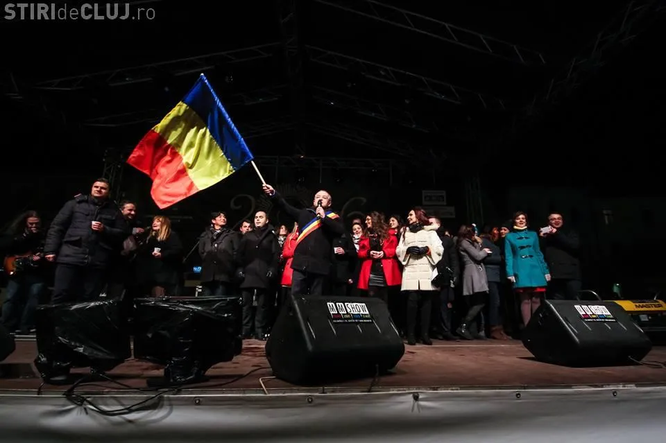 Peste 3000 de clujeni au fost în noaptea dintre ani în Piața Unirii. Emil Boc a dat drumul la focul de artificii, iar un erou de la incendiul din Clubul Colectiv a urcat pe scenă.