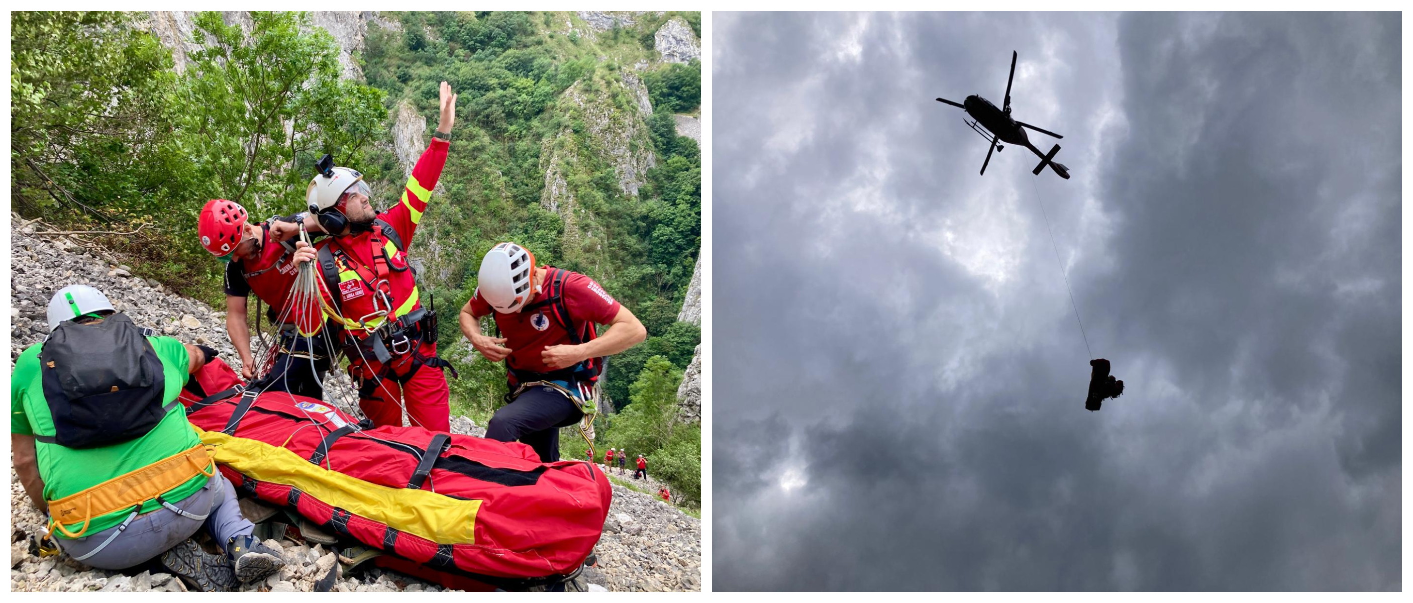 În același timp, în sprijinul echipei din Cheile Turzii au venit și salvamontiștii care asigurau permanența în Baza Băișoara. Împreună, aceștia au reușit o manevră extrem de riscantă: transportul victimei pe targă pe o distanță de circa 70 de metri, printr-o zonă de grohotiș abrupt, până într-un punct în care medicul de pe elicopter a putut fi coborât prin troliere pentru a ajunge la rănit.