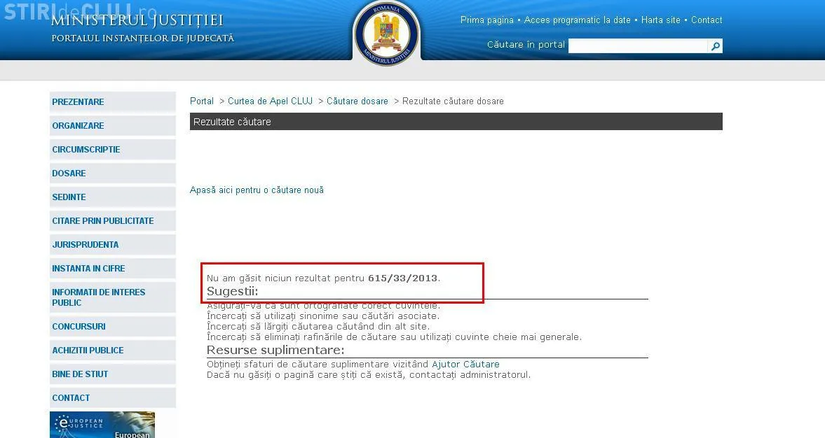 Oficial, dosarul a primit numărul 615-33-2013, dar acesta nu poate fi accesat nici de pe just.ro şi nici de pe adresa de internet a Curţii de Apel Cluj. Deşi, oficial acest dosar există şi se află la al treilea termen de judecată, mesajul pe care îl primeşti accesând cele două adrese este următorul: ”nu am găsit niciun rezultat pentriu dosarul numărul 615-33-2013”.