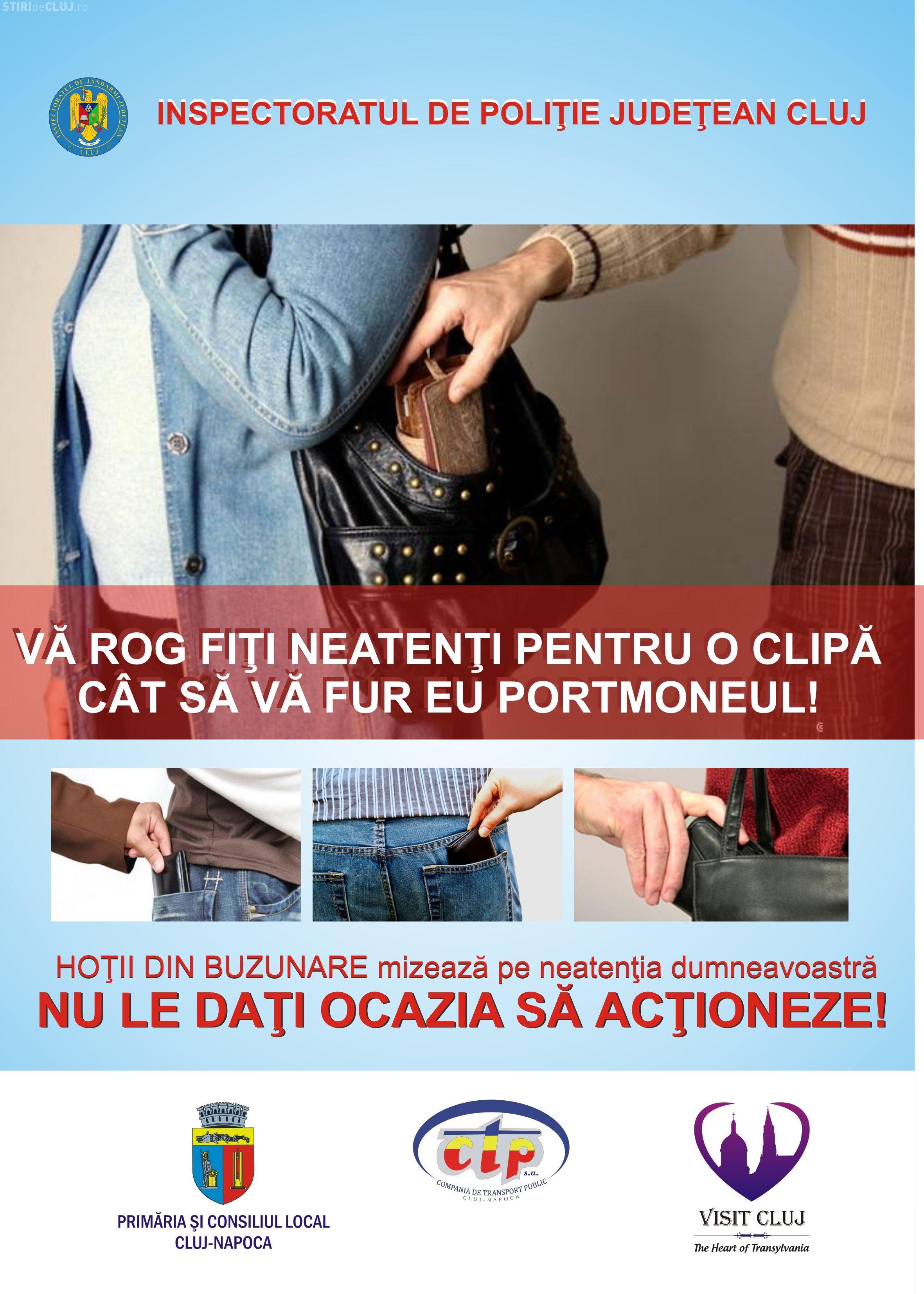 ”La data de 30 septembrie a.c., poliţiştii de prevenire, împreună cu cei de proximitate şi de investigaţii criminale, au acţionat pe raza municipiului Cluj-Napoca, pentru prevenirea furturilor din buzunare şi poşete, fapte care se comit, cu precădere, pe mijloacele de transport în comun”, anunță IPJ Cluj.