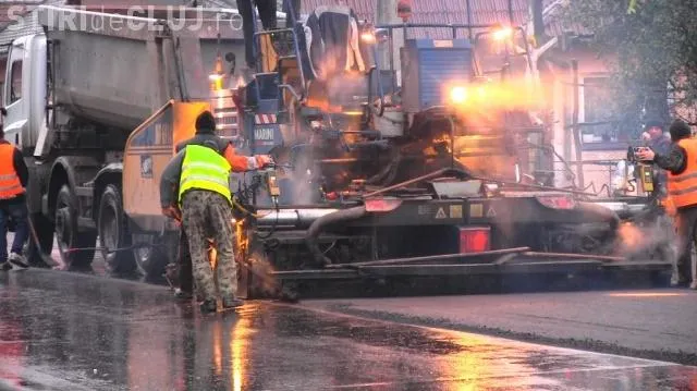 Cum se asfaltează pe ploaie torențială la Dej. Afară turna cu găleata, dar muncitorii lucrau cu spor VIDEO