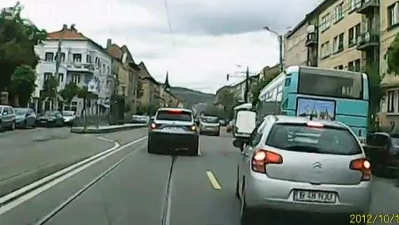 ”Dupa o incadrare gresita la semafor si mai multe manevre indraznete in trafic, depaseste coloana de masini prin statia de tramvai, apoi intoarce peste linia dubla continua”, a scris clujeanul, care a postat imaginile pe YouTube.