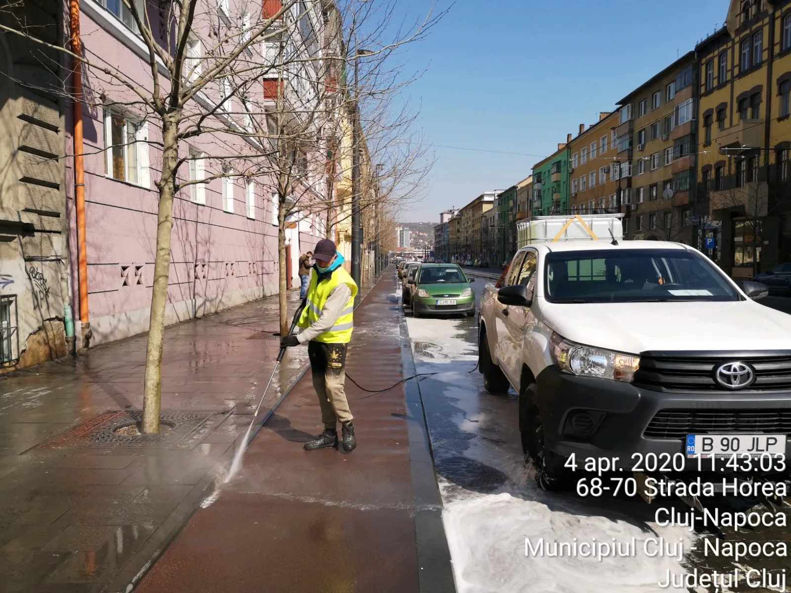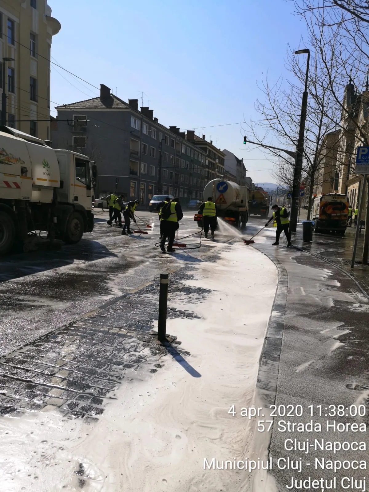 ”Avem toate utilajele scoase pe teren la curățenia stradală. Se spală cu detergent, nu se spală cu hipoclorit de sodiu. Recomandarea celor din Primăria Cluj-Napoca și a celor de la Direcția de Sănătate Publică spune că nu este bine să se spele cu soluții bazate pe hipoclorit de sodiu din mai multe motive. Sunt dăunătoare naturii și oamenilor, iar eficiența este extrem de scăzută, de aceea chiar și organizația Mondială a Sănătății recomandă spălarea cu soluții bazate pe detergent, care e ecologic, biodegradabil și nu afectează în niciun fel natura.
