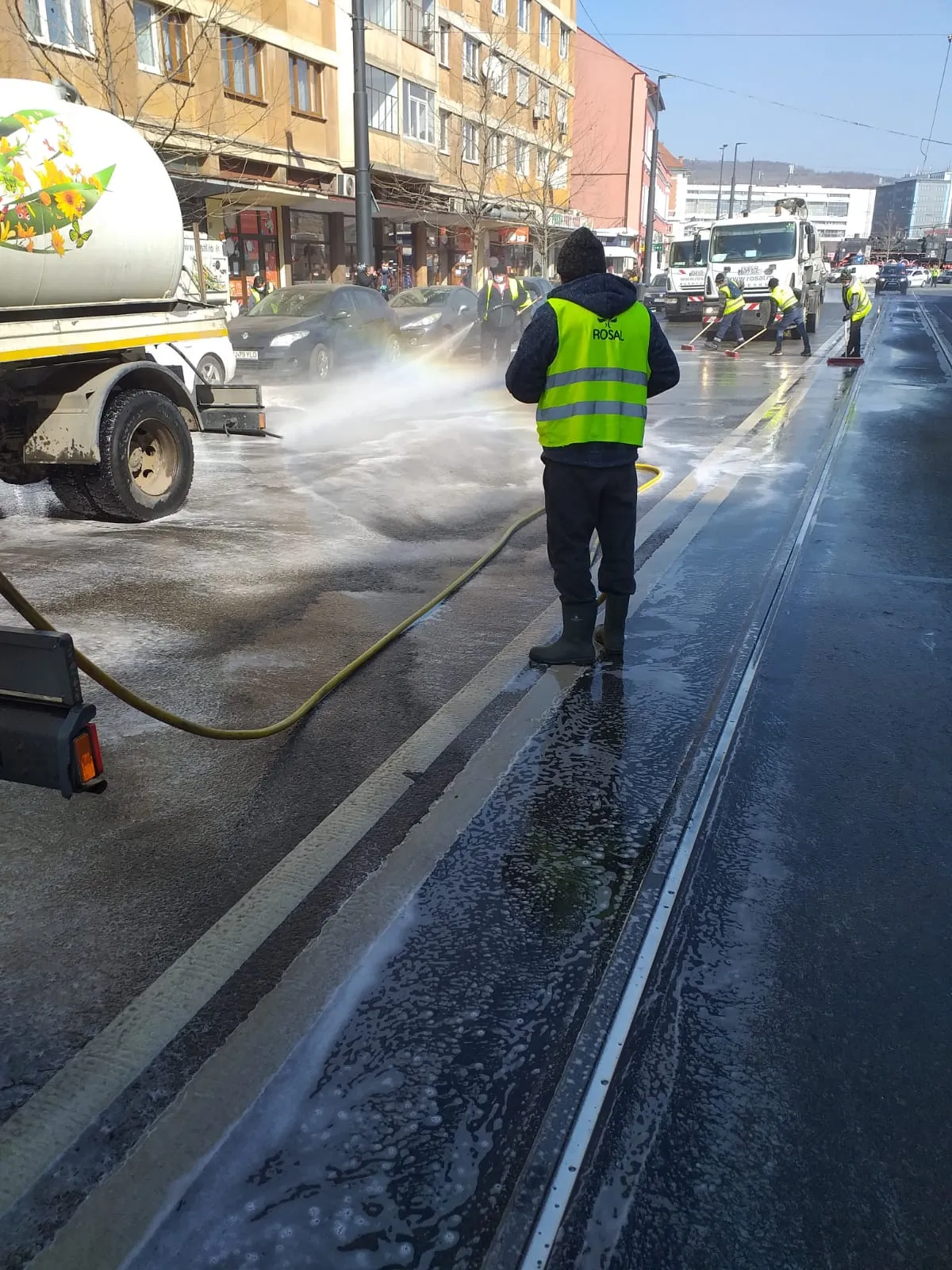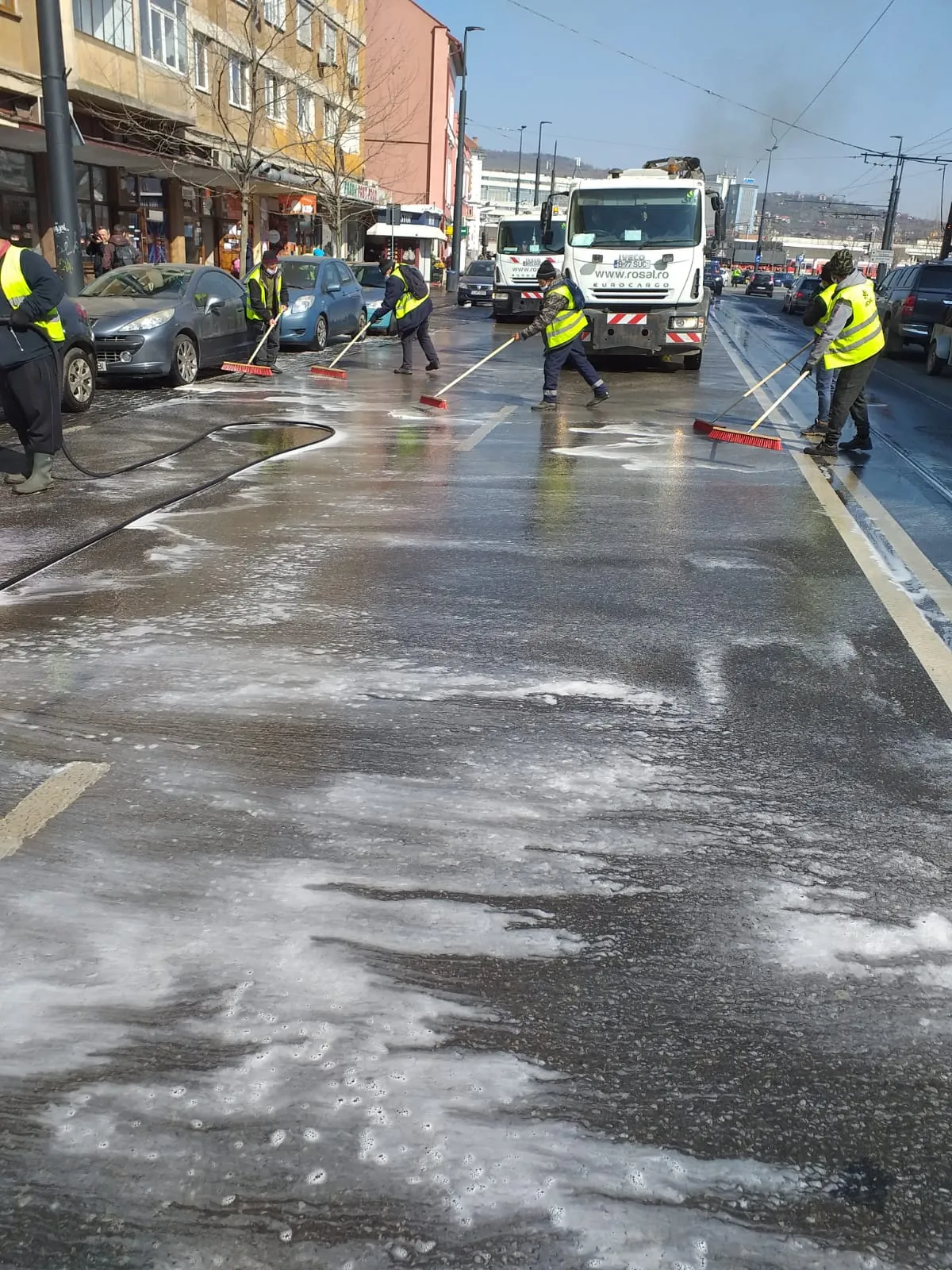 Mergem în baterii de utilaje. Se merge cu o cisternă care este cu acest detergent, după care vine o cisternă cu apă și o perie care curăță, inclusiv pe carosabil și pe trotuar”, a spus Radu Roșu, directorul Rosal Cluj.